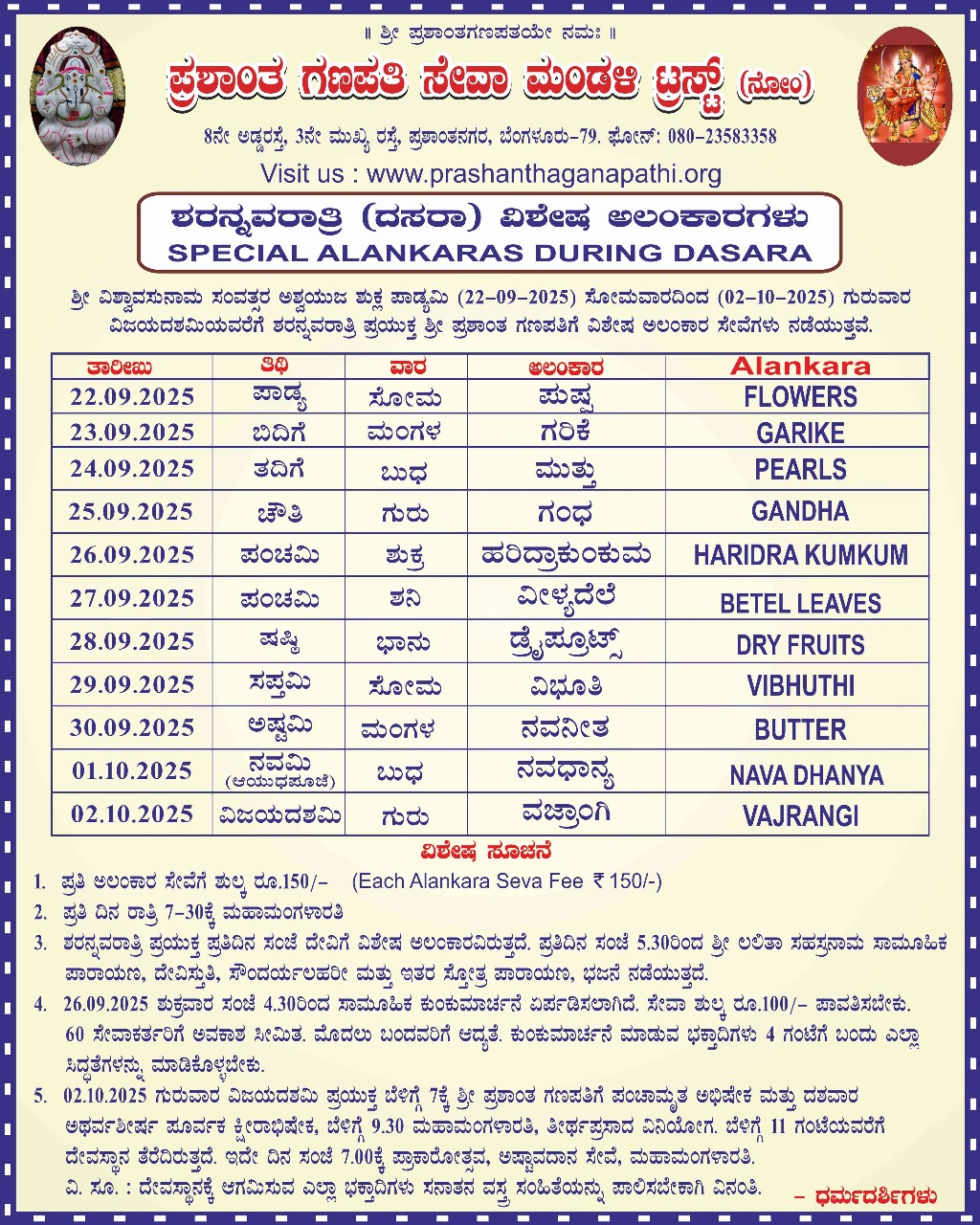 During Sharannavaratri (Dasara), special Alankara Sevas will be offered to Sri Prashantha Ganapathi. From Monday, September 22, 2025 (Padya), until Thursday, October 02, 2025 (Vijayadashami), there will be unique daily Alankara Sevas to Sri Prashantha Ganapathi.